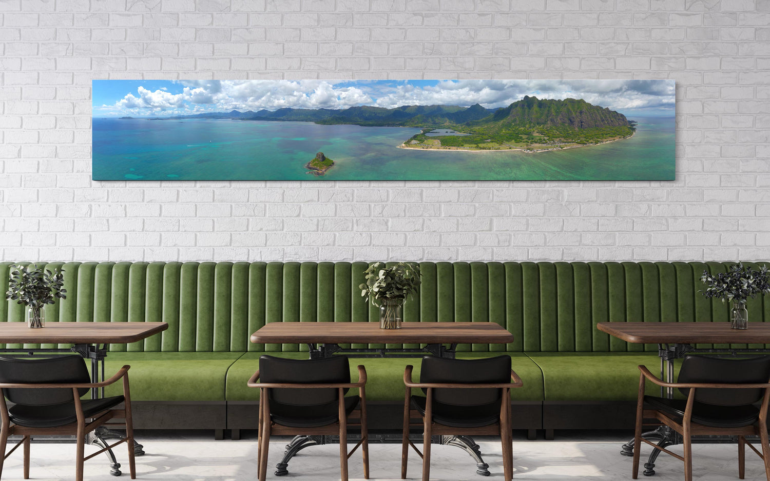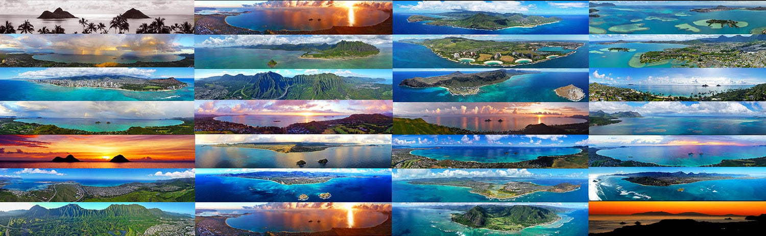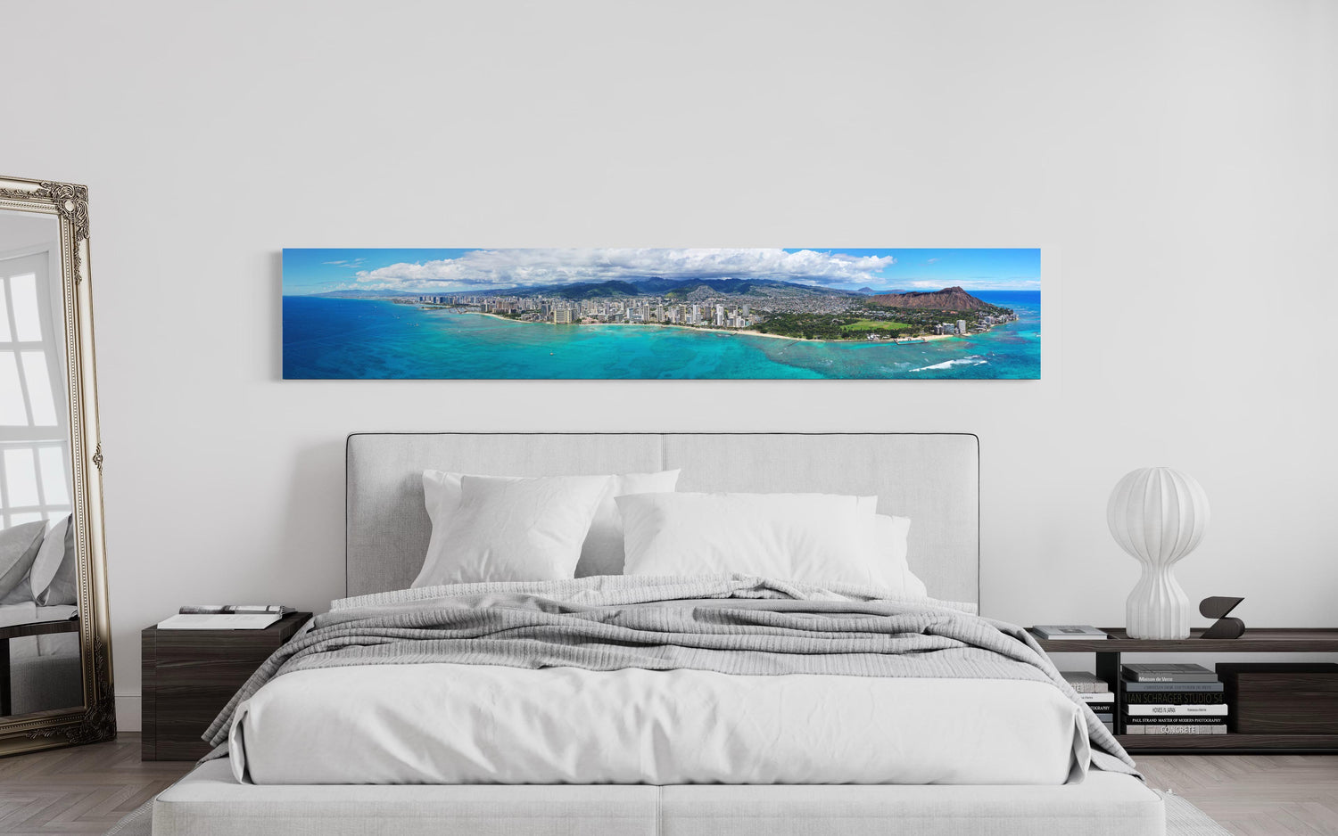 The COLORS OF HAWAII FINE ART has brought you the biggest and best variety of imagery for your home or office. This NEW aerial panorama series of Oahu captures Hawaii like you've never seen. It is sure to be just what you're looking for to hang on your wall or give as a gift to someone special. Please call us at 808-422-2300 any time during business hours in Hawaii and we'll consult and help you find the perfect images! Mahalo and have a great year, Patrick and Susan Benay